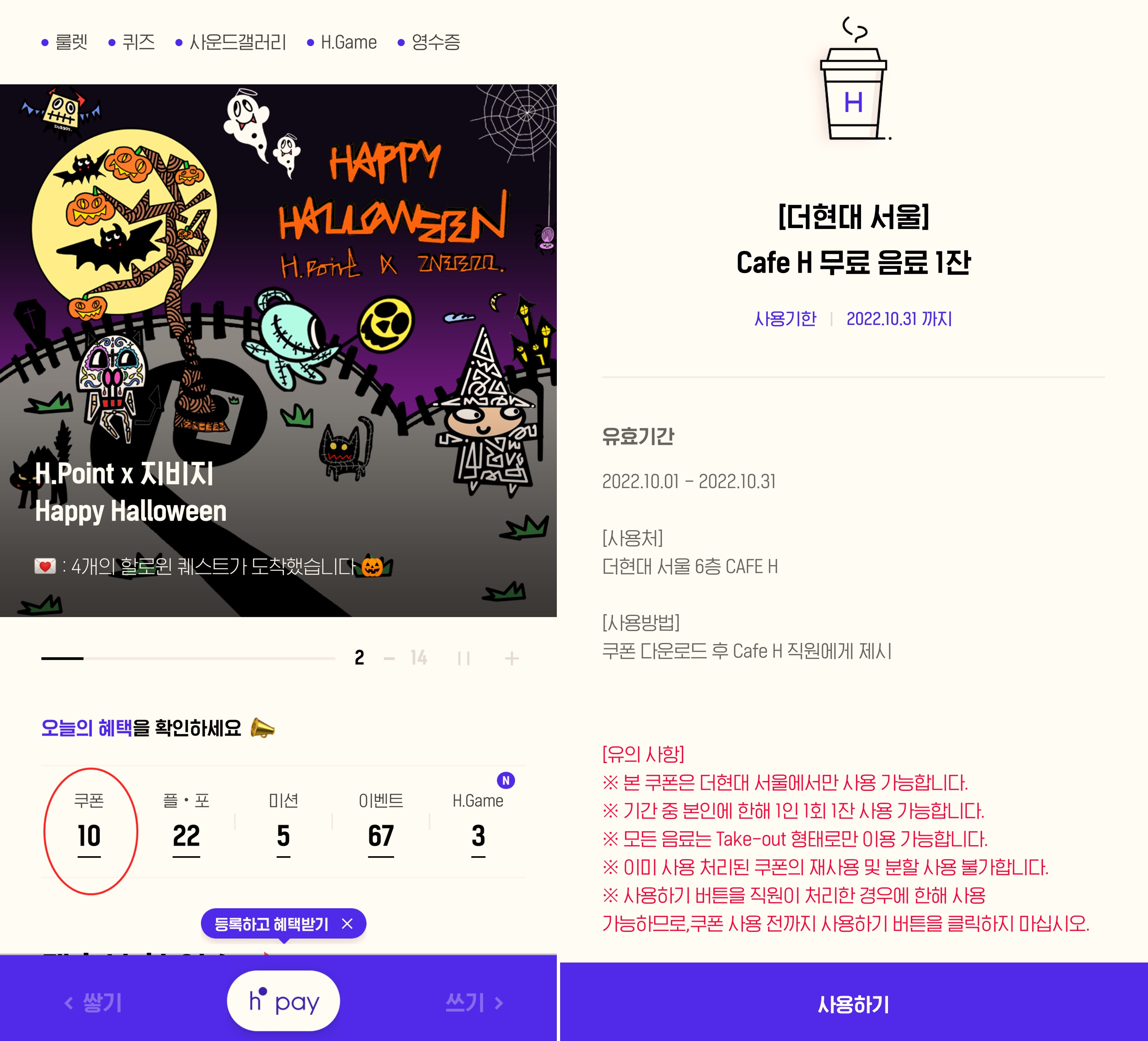 H포인트 앱을 깔고 로그인 후 쿠폰으로 들어가면